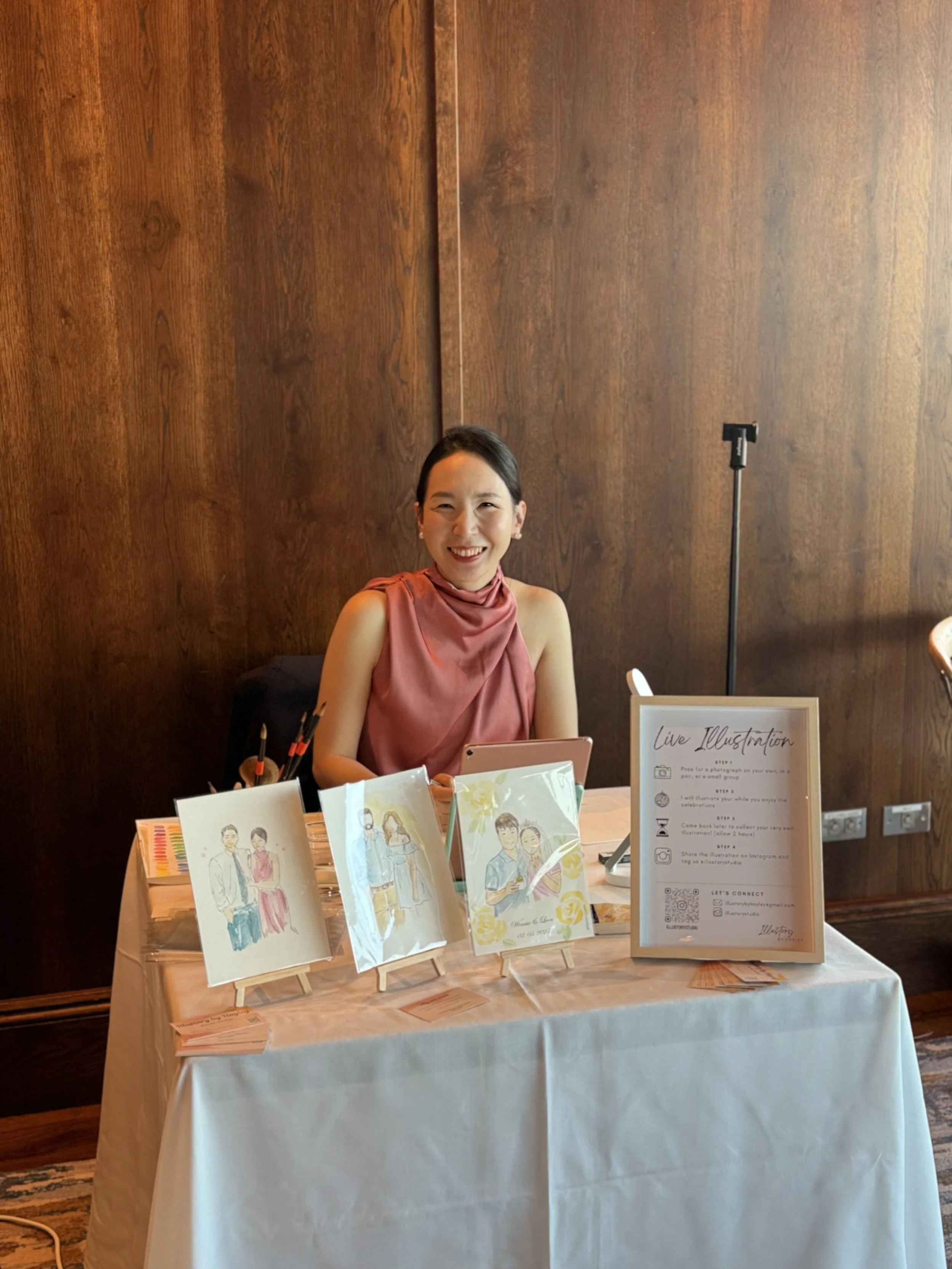 • Hayley was fantastic!! All of our guests raved about their painting and loved that they got to take it with them on the day, the paintings completed after the event were delivered so promptly - with photos of the guests to take out our guess work! Hayley's professionalism, fantastic communication and presence on the day was exactly what we were looking for. Our portrait that Hayley added of us after the day, is sitting proudly in the living room already - we would highly recommend illustory studio for your next event!