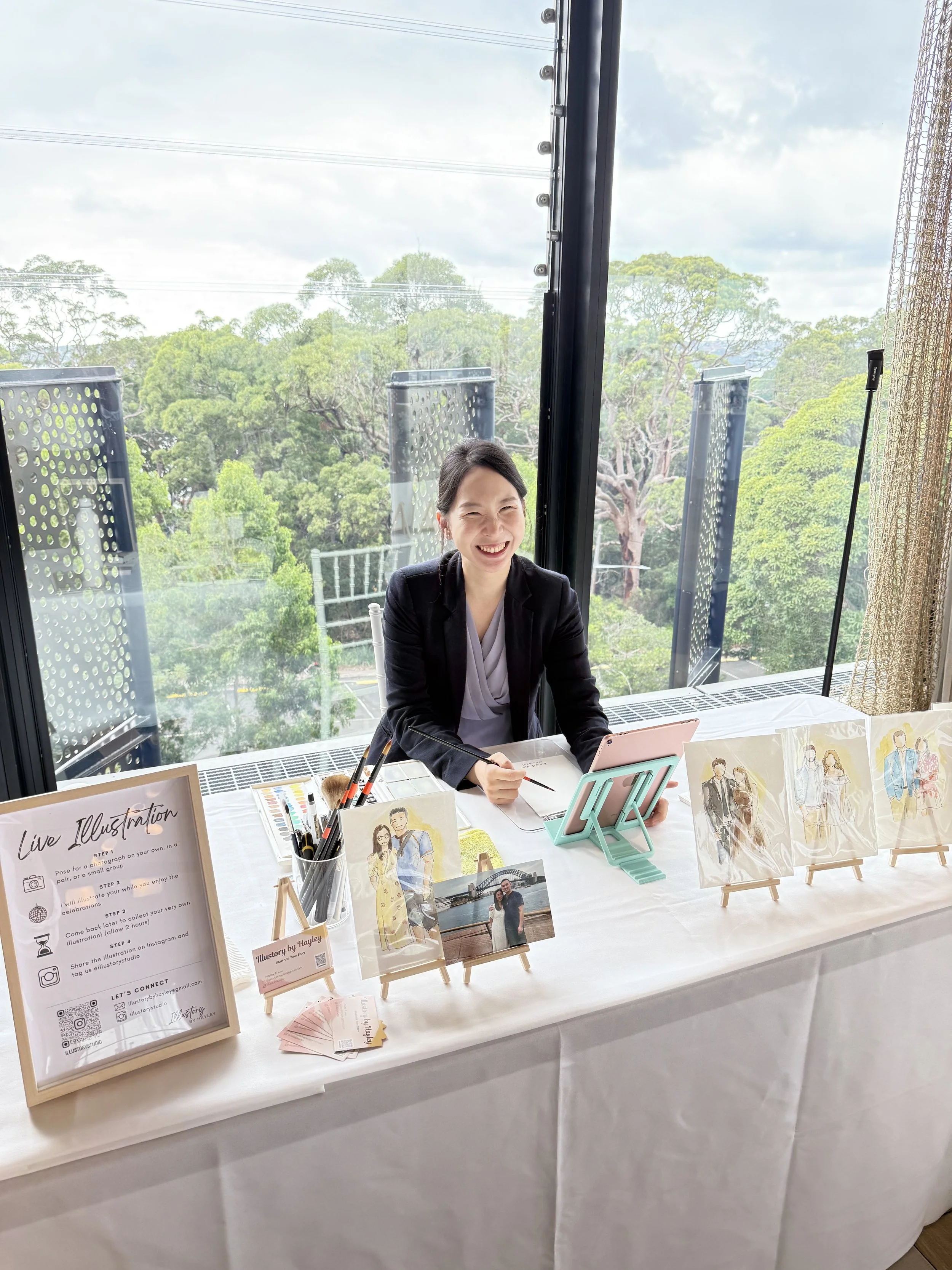With over 20 years of drawing experience, one of my greatest joys is creating live wedding illustrations. I adore watching a couple’s love story unfold right in front of me—it’s such a magical, emotional day, and capturing those moments while mingling with joyful guests always fills my heart.